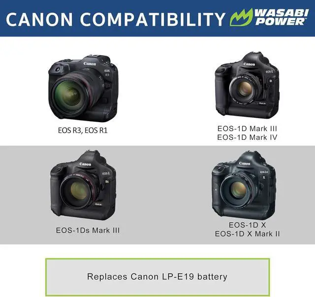 LPE19 batteries: Canon EOS R3, EOS-1D Mark III, EOS-1D Mark IV, EOS-1Ds Mark III, EOS-1D X, EOS-1D X Mark II, EOS-1D X Mark III