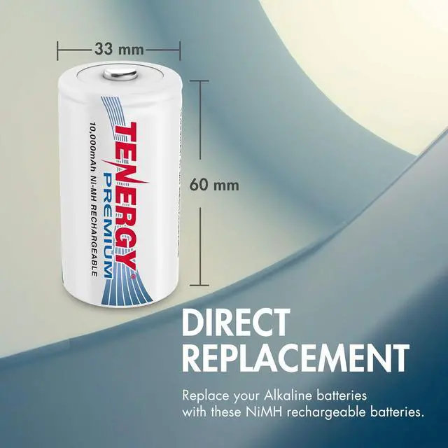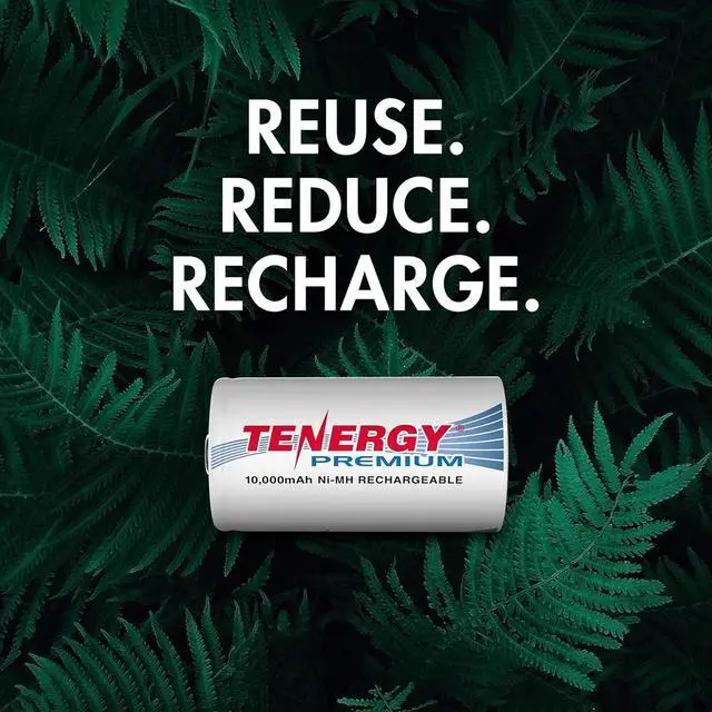Tenergy Premium rechargeable D cell batteries are reusable up to 1, 200 times, and quickly pays for themselves after 10 uses. Avoid wasting time and money on the disposable alkaline batteries and replace them with our 1.2V Premium Rechargeable NiMH D Battery to decrease the waste disposables leave behind.