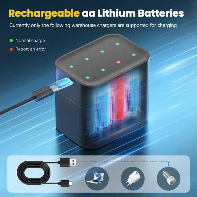 Speedy Battery Charger: The batteries can be fully charged in 2.5 hours with our lithium AA battery charger, output current of 8 slots reach 350mA*8 (Max 375mA), 5V3A input volt of charger ensure charging speed faster than traditional Ni-MH rechargeable batteries. Charger indicator Lights Keeps Flash Green when Charging, the light gets solid green when fully charged.