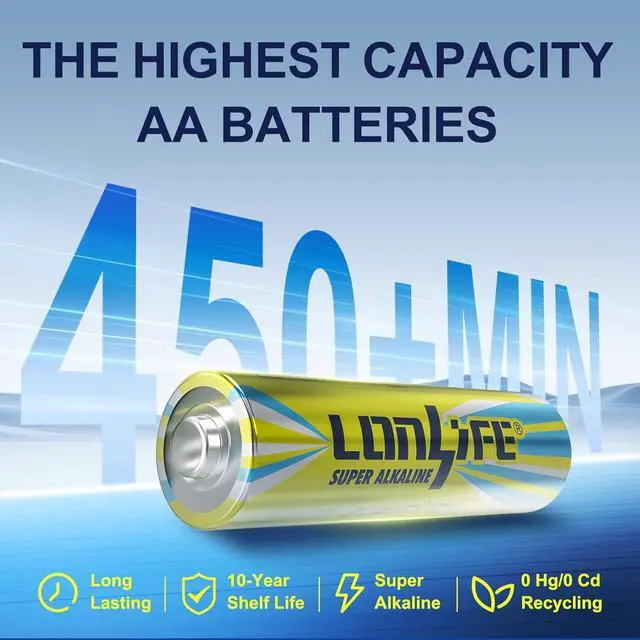 Green Innovation & Eco-friendlyLONLIFE alkaline AA batteries are completely free of mercury and cadmium, creating a sustainable choice for your home and the planet. Ensures safe disposal while minimizing environmental harmdelivering top-tier performance while aligning with your green values