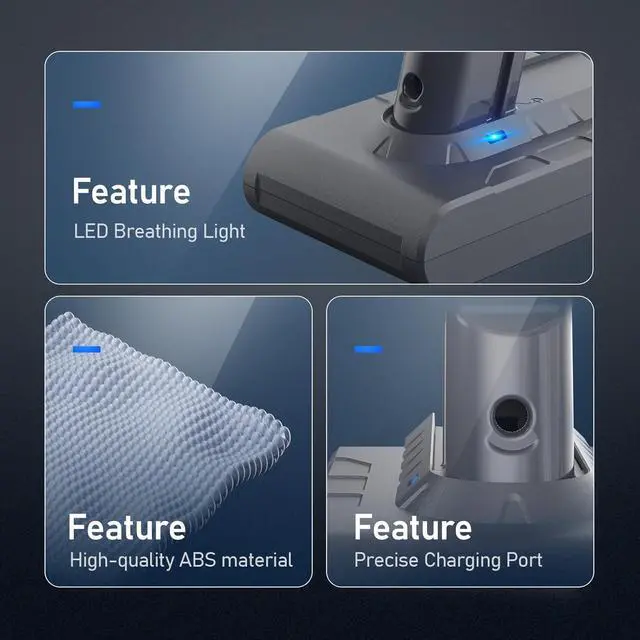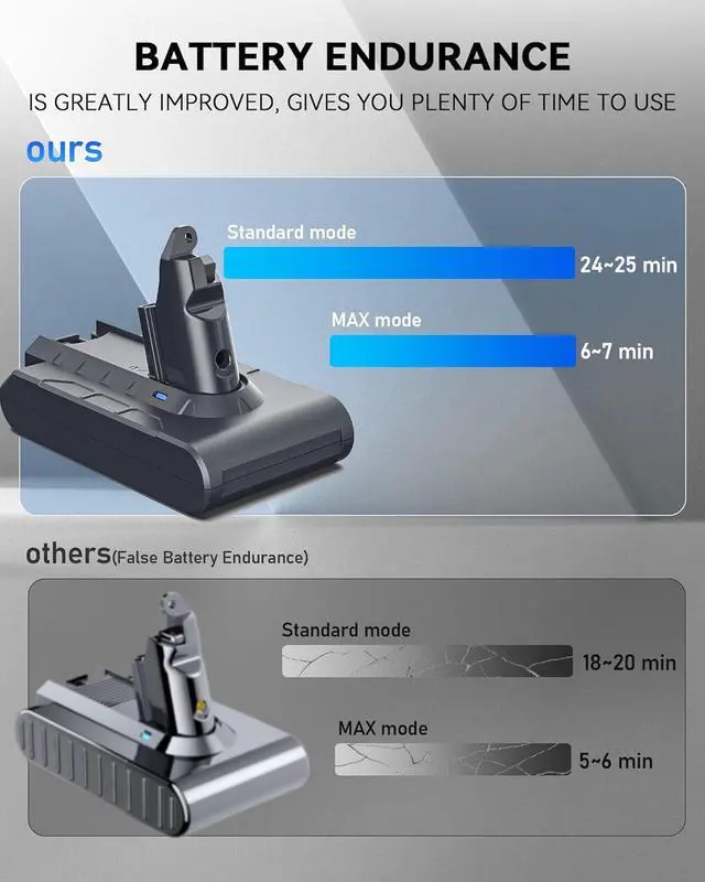 SAFE AND CONVENIENT: We have carried out an advanced intelligent protection design for this V6 battery, so it is safe for your vacuum cleaner and has the same size and function as the original V6 battery. Easy to install and support the wall mount charger.