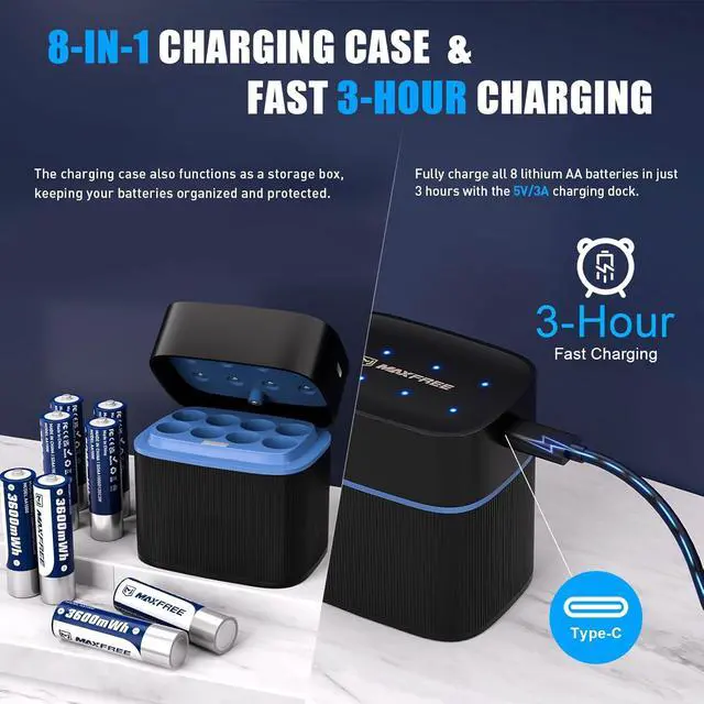 FAST 3-HOUR CHARGING & 8-IN-1 CHARGING CASE: Fully charge all 8 lithium aa batteries in just 3 hours with the 5V/3A charging dock. The charging case also functions as a storage box, keeping your batteries organized and protected.