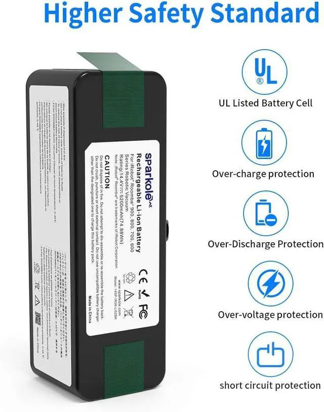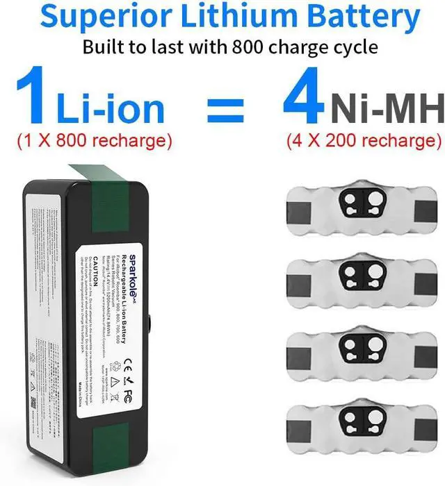 Superb Longevity: Made from premium battery cells with high durability, the sparkole roomba battery can be recharged for 800 times, self-discharge rate is as low as 1% per month, allowing for up to 2 years of daily use. No more frequent replacing with NiMH batteries.