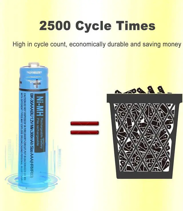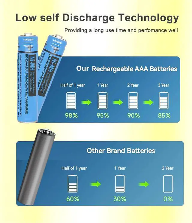 Long Battery LifeRechargeable NiMH batteries can be recycled, Rechargeable up to 2500 times. With Low self-discharge technology and high-quality Class A batteries, which can prolong battery life, reusable, economical and efficient. Reusable, cost-effective, Keeps your pansonic cordless landline phones alive!
