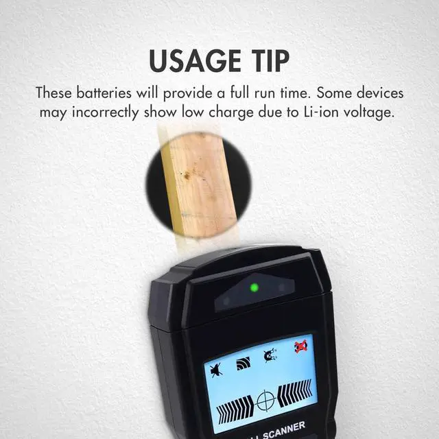Standard size 9V batteries - Direct replacement for any 9V Alkaline or 9V NiMH battery electronics. *Li-ion lower voltage may trigger false positive for low power, this is normal and the battery will still provide the full run time.