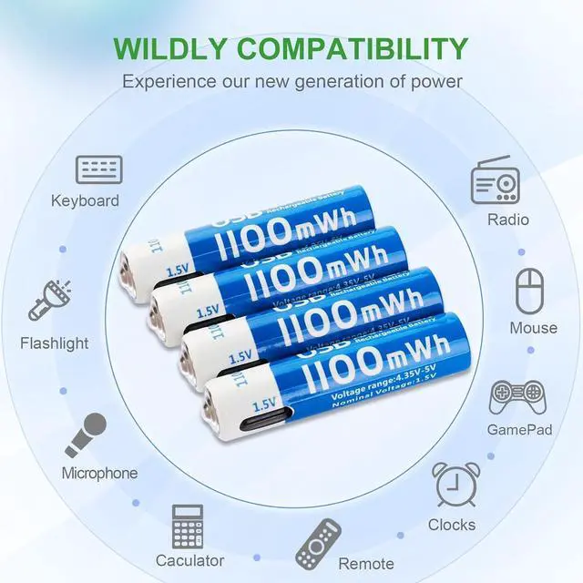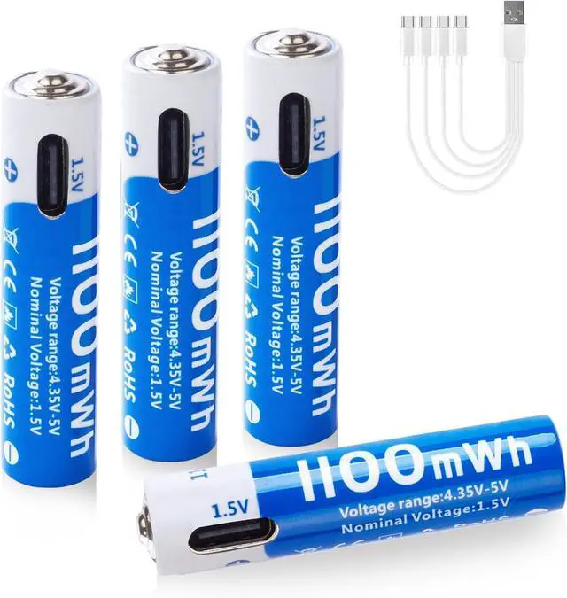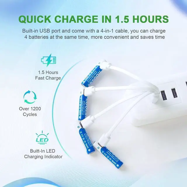 1.5 Hours Fast ChargingThese AAA size batteries are easily charged with a 4-in-1 USB-C cable, eliminating the need for a charger and adapter, and can be fully charged in approximately 1.5 hours. Built-in LED shows the charging process, with a flashing green light indicating charging and a solid green light indicating full charge.