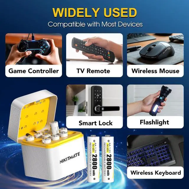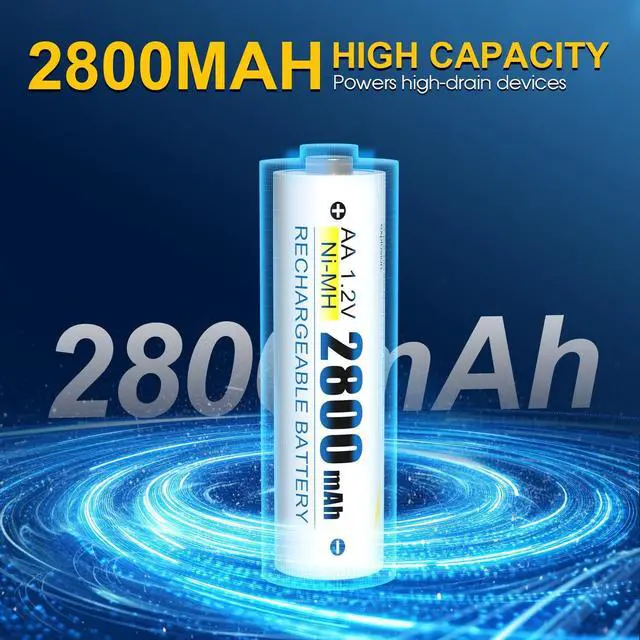 Ultimate Rechargeable Battery KitOur 12-Slot Smart Charger with 12 pack Ni-MH rechargeable AA batteries creates a complete charging ecosystem. The 2800mAh high capacity reliably powers your game controllers, smart locks, toys, and more. Power your entire life without interruption.