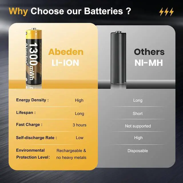 Output: Abeden 4- pack AAA rechargeable lithium batteries feature a robust 1300mWh capacity per cell. They deliver a constant 1.5V output throughout the entire discharge cycle, providing long - lasting and stable power support for devices.