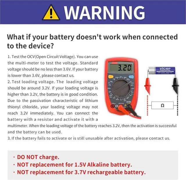 6. Please check your devices voltage and battery type requirements before purchase. This is a 3.6V ER14505 battery, not compatible with standard 1.5V or 3V devices unless specified.