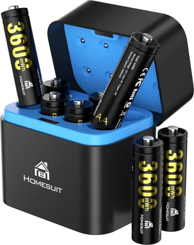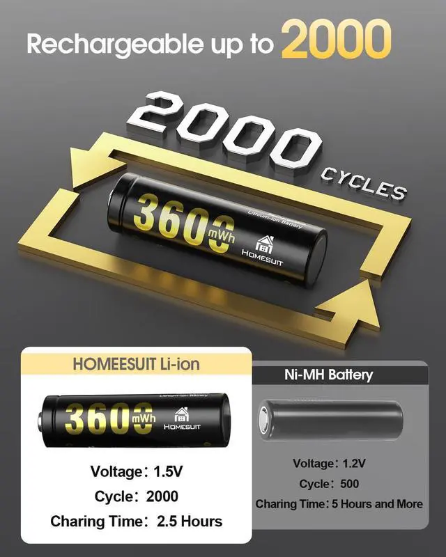 Rechargeable AA Batteries Lithium: Homesuit rechargeable lithium aa batteries, with 3600mWh high and real capacity, have 1.5V constant output and recharge up to 2000+ cycles time. Reliable aa lithium batteries with intelligent BMS and self-detection