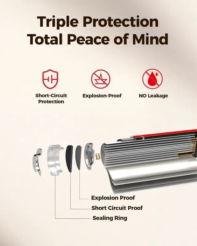 Safety Comes FirstFeaturing 3-layer protection of leak-proof, explosion-proof valve, short-circuit protection, making them the best choice for high-end electronics