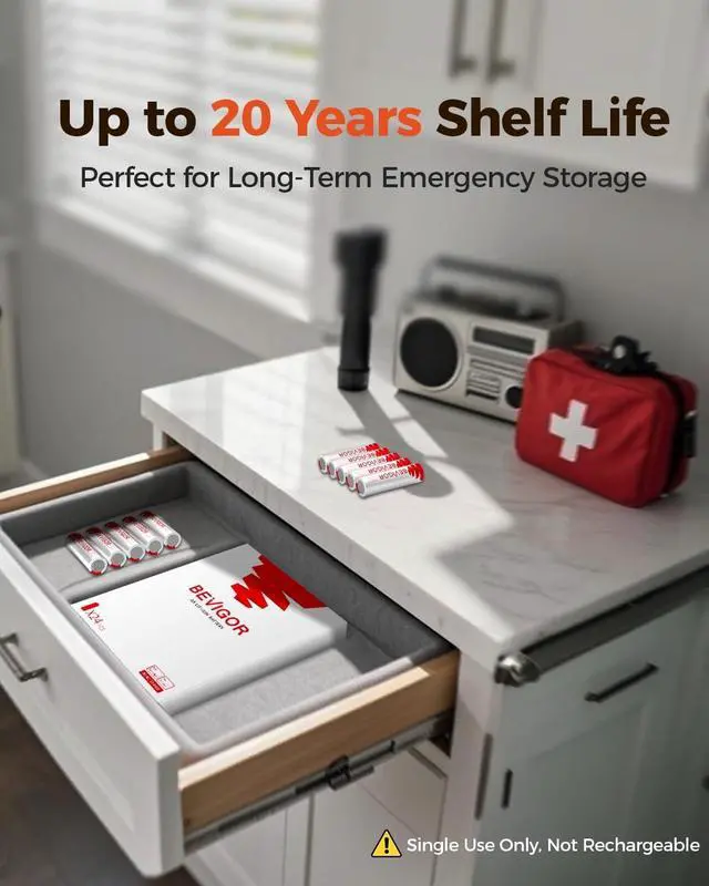 20-Year Shelf LifeWith up to 20 years of shelf life and less than 1%/year self-discharge rate, Bevigor double a lithium batteries are always ready whenever needed