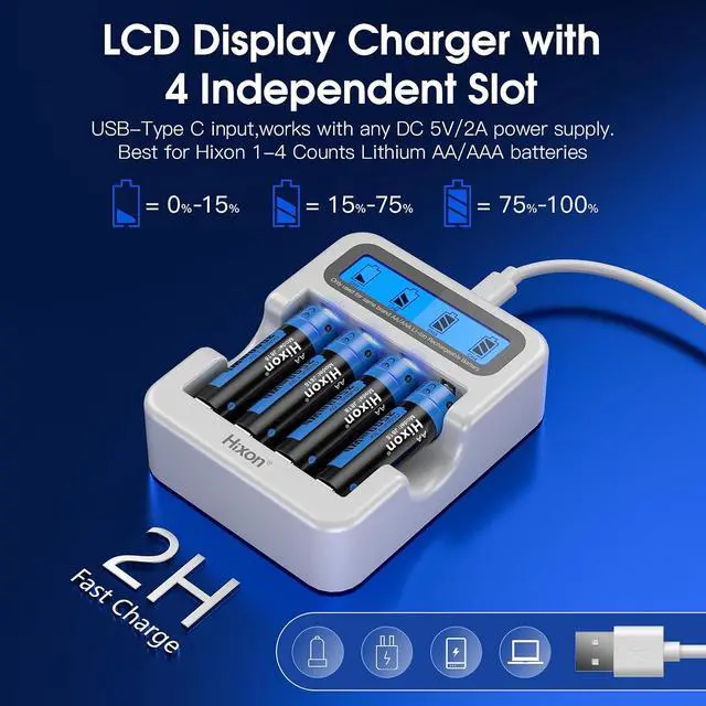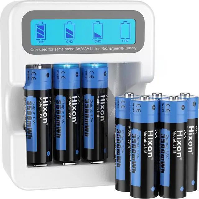 Excellent Service: You will get 8 pack Hixon J818 aa rechargeable lithium batteries; 1 pack Hixon Q032 4-slot LCD aa aaa li-ion battery charger; 1 USB Type C cable; 2 battery storage case. Customer service of 30-day money back and 12-month warranty.