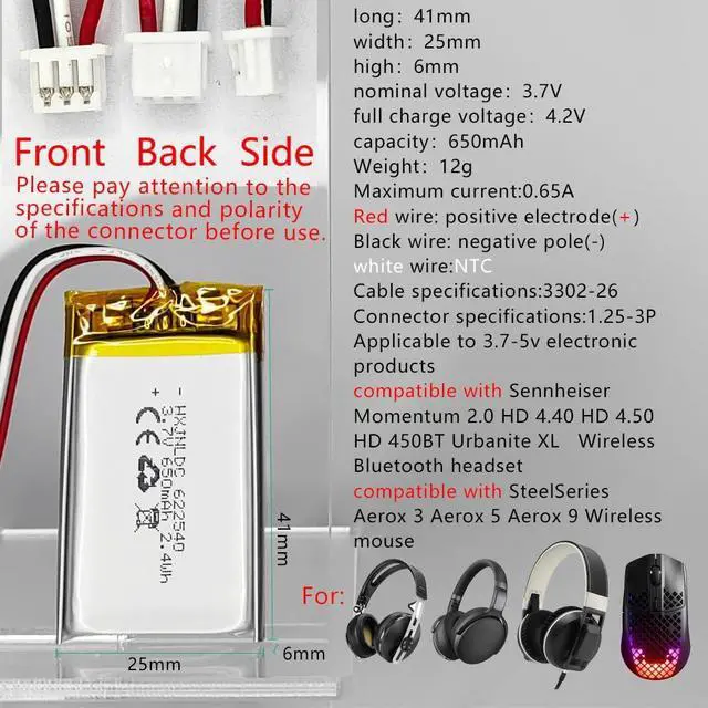 Compatible with Sennheiser Momentum 2.0 HD 4.40 HD 4.50 450BT Urbanite XL Wireless Bluetooth Headphones Aerox 9 Aerox 5 mouse Battery ReplacementIt can also be used in other 3.7 -5V electronic products with power less than 2.4W h (650mAh). Not applicable to high-power electric tools and model aircraft