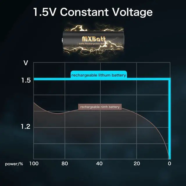 1.5V Constant Voltage: Lithium rechargeable batteries are suitable for equipment with strict voltage devices; Charged AA lithium batteries maintain 1.5V under 100% to 0% capacitance