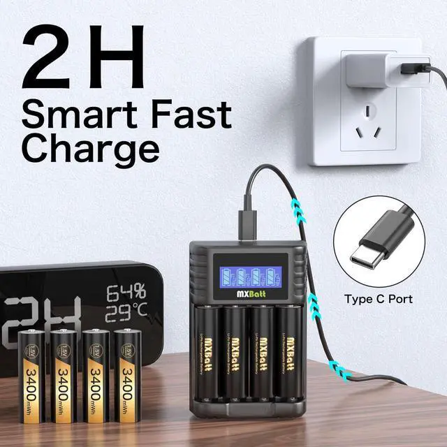 LCD Fast Charger: with independent USB 8 slot fast charger, LCD display can show the battery charging condition in real time, it only need 2H to get a full charge which will be faster than similar products; charger only supports MXBatt brand lithium AA AAA rechargeable battery