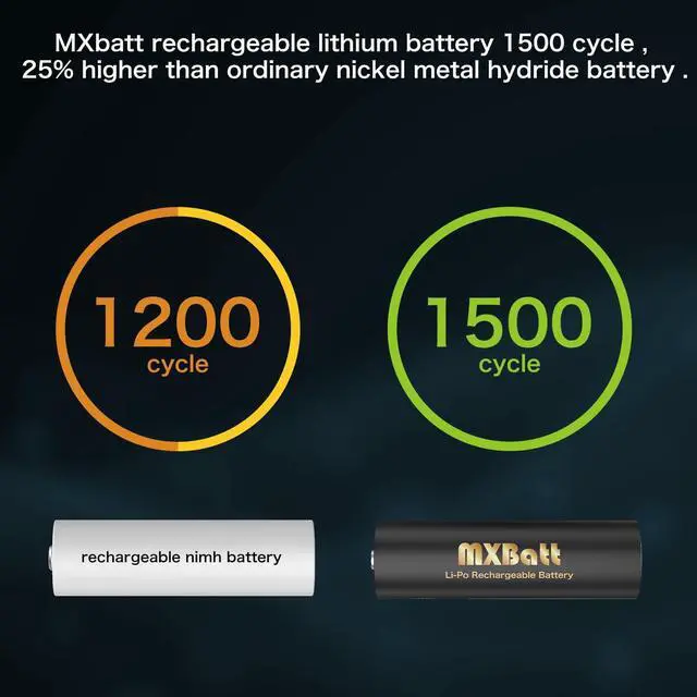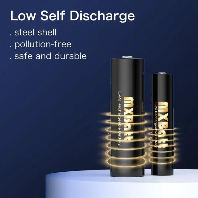 Low Self DischargeThe use of MXBatt rechargeable lithium AA battery can be charged 1500 times, energy saving and environmental protection, fully charged can be stored for 1 to 2 months