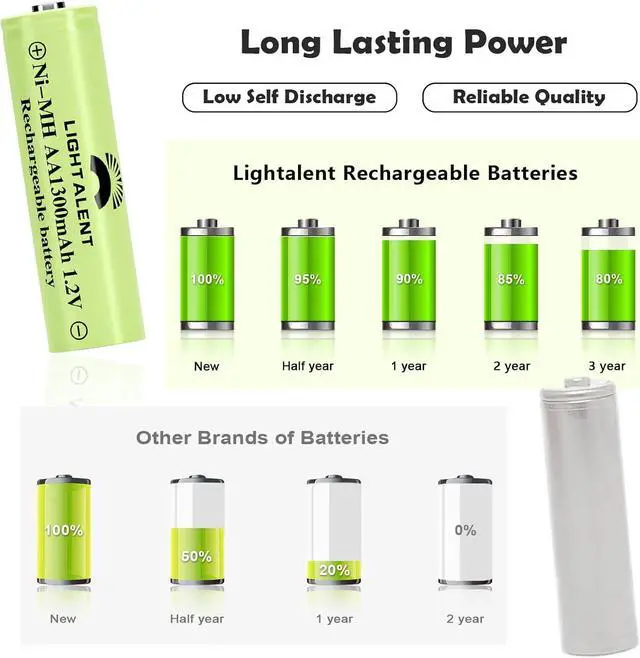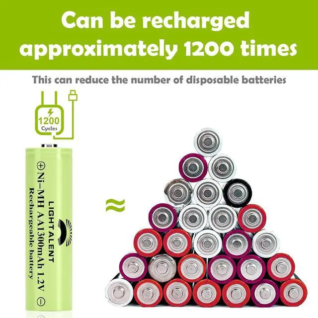 • High Performance LIGHTALENT Ni-MH rechargeable AA battery with built-in 1300mAh large capacity, can be used more than 1200 times by recharging, longer lasting than NiCD batteries