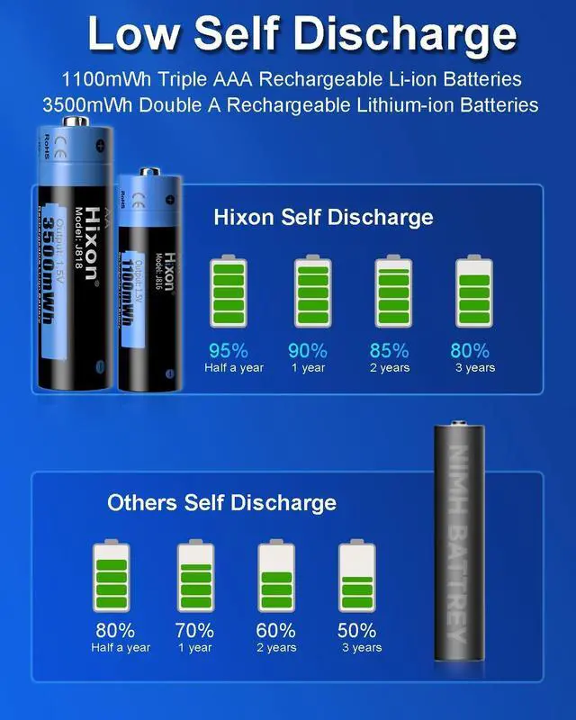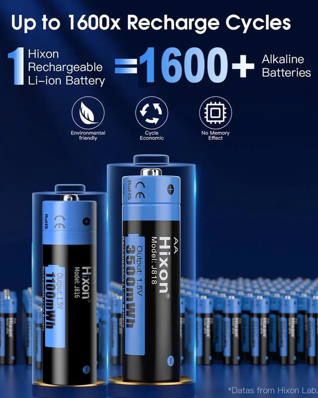Saving Money: Hixon advanced lithium-ion battery technology, 1 pack 3500mWh aa or 1100mWh aaa lithium battery can be recharged up to 1600 real times. Equivalent to thousands of dry batteries. Eventrough these rechargeable li-ion battery more expensive than disposable batteries, considering its 12-year battery shelf life, low-self-discharge, and Long-term use will saves much money. Free of harmful substances, not only economical but also environmentally friendly