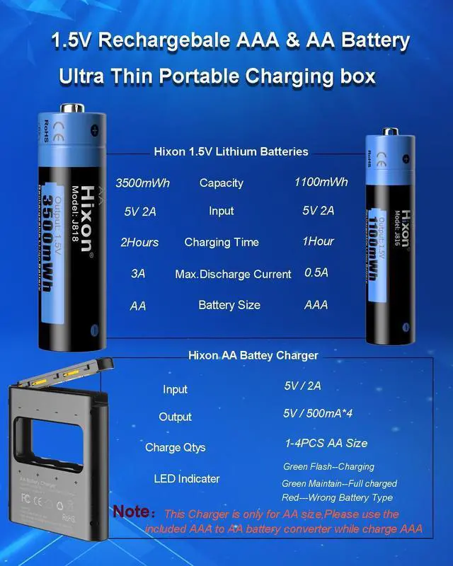 What You Get: 4* AAA and 4* AA Hixon Rechargeable lithium batteries; 1* Smart Charging box; 1* Type C charging Cable; 4*AAA to AA Converters; 1*battery storage case; 1* User Manual; 12 months warranty