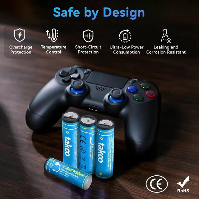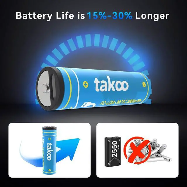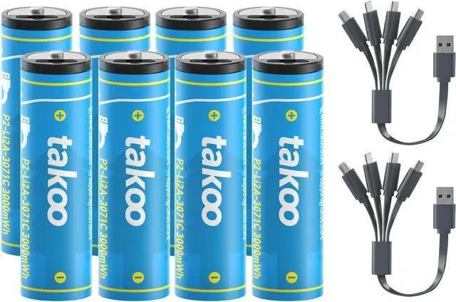 Long Lasting Rechargeable AA & AAA Batteries TAKOO Type-C USB rechargeable AA (3000mWh) and AAA (880mWh) batteries feature large capacities and fast 1.5H charging. With up to 1100 charge cycles and a convenient Type-C charging port, theyre perfect for high-performance devices and help you save on constant battery replacements.