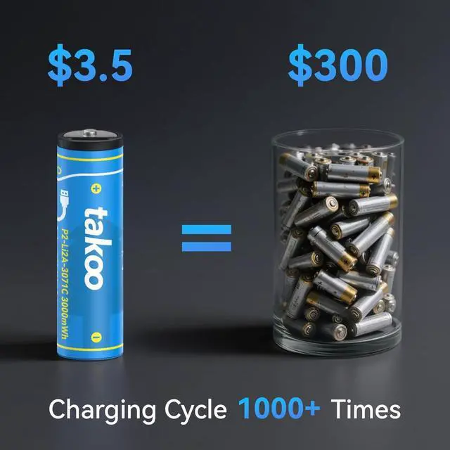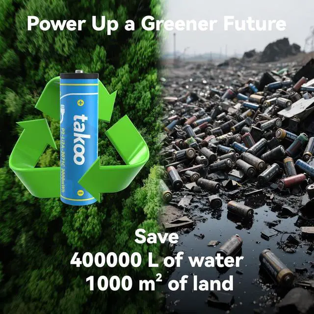 Eco-Friendly & Cost-Saving TAKOO is committed to sustainability. One rechargeable AA or AAA battery can replace up to 1000 disposable alkaline batteries, dramatically reducing waste and save money. With low attenuation and long service life, our rechargeable AA, AAA, 9V, and D-size batteries are a smart, safe, and green choice.