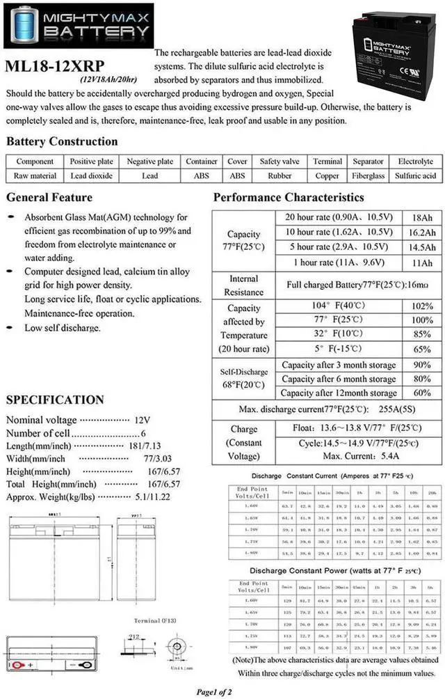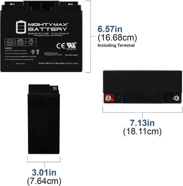 ML18-12XRP SLA is a 12V 18AH Sealed Lead Acid (SLA) rechargeable maintenance free battery - UL Certified