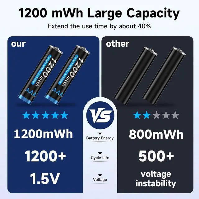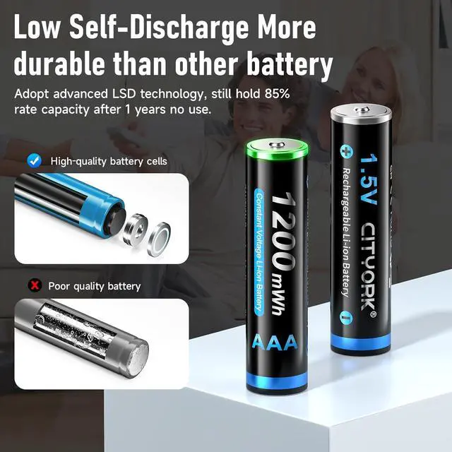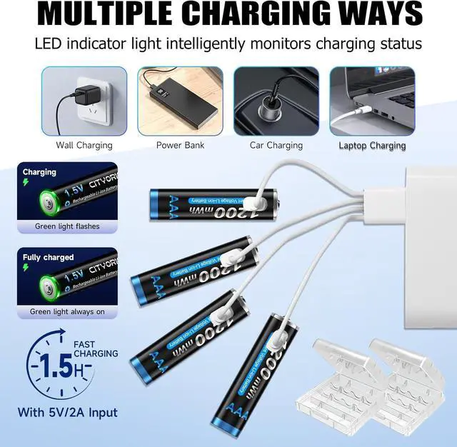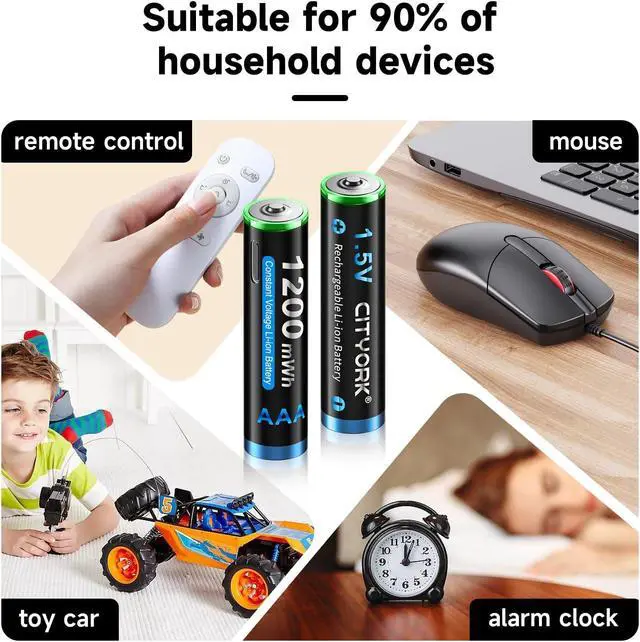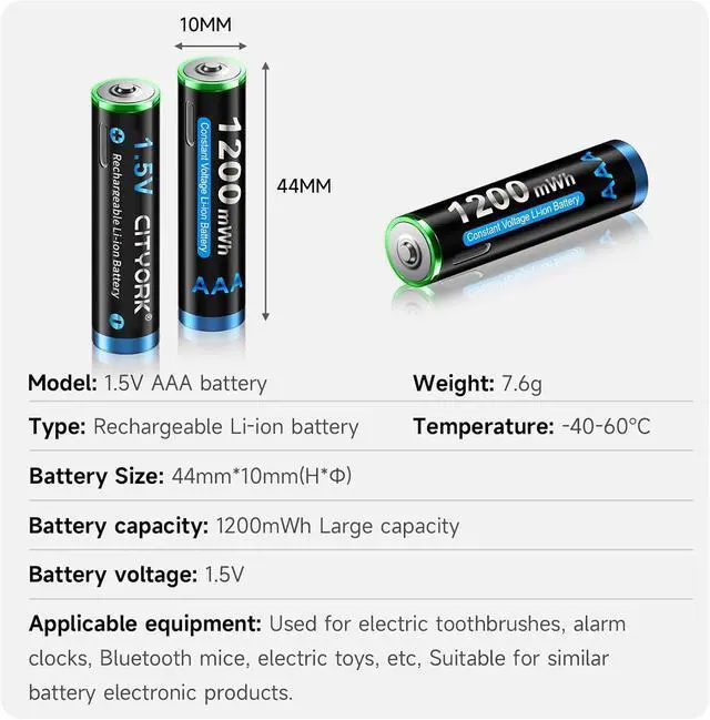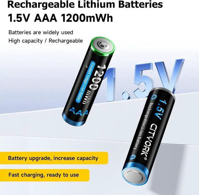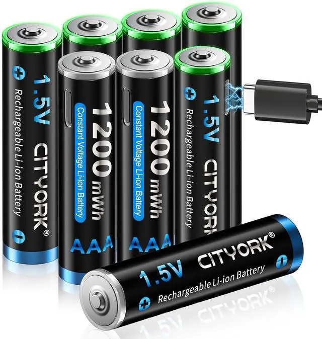 USB-C Rechargeable AAA Lithium Batteries: 8 Pack 1.5V usb-c AAA 1200mWh Rechargeable Battery, 1.5 v constant output2H fast charging. Compared with NI-MH/non-rechargeable batteries, CITYORK USB AAA rechargeable lithium-ion batteries let you get rid of the hassle of changing batteries frequently, helping you to reduce waste and save money and time