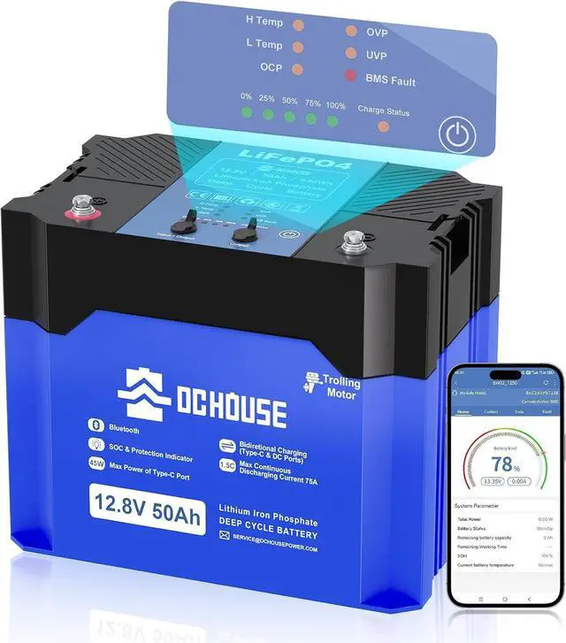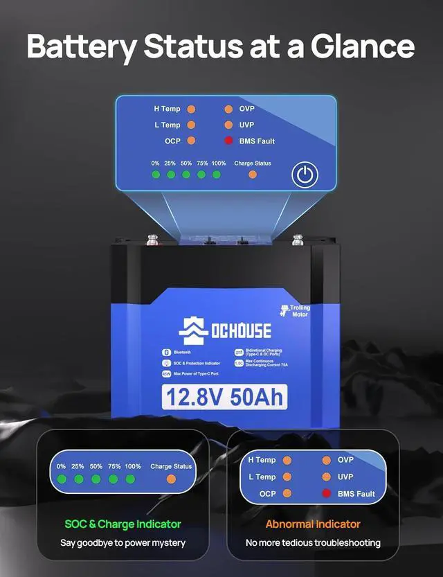 SOC Status Indicator: Upgraded 2.0 12V 50Ah trolling motor LiFePO4 battery features visual LED indicators for easy real-time monitoring. It displays the LiFePO4 batterys remaining SOC level, high and low temperature warnings, short circuit, overvoltage, undervoltage, BMS fault, and charging status. It also includes a one-button activation switch for convenient operation.
