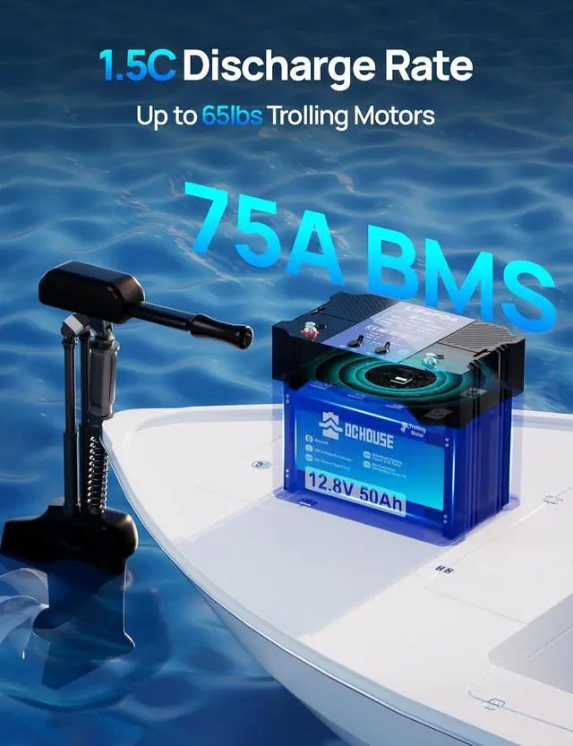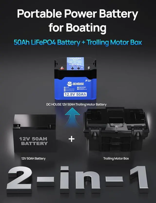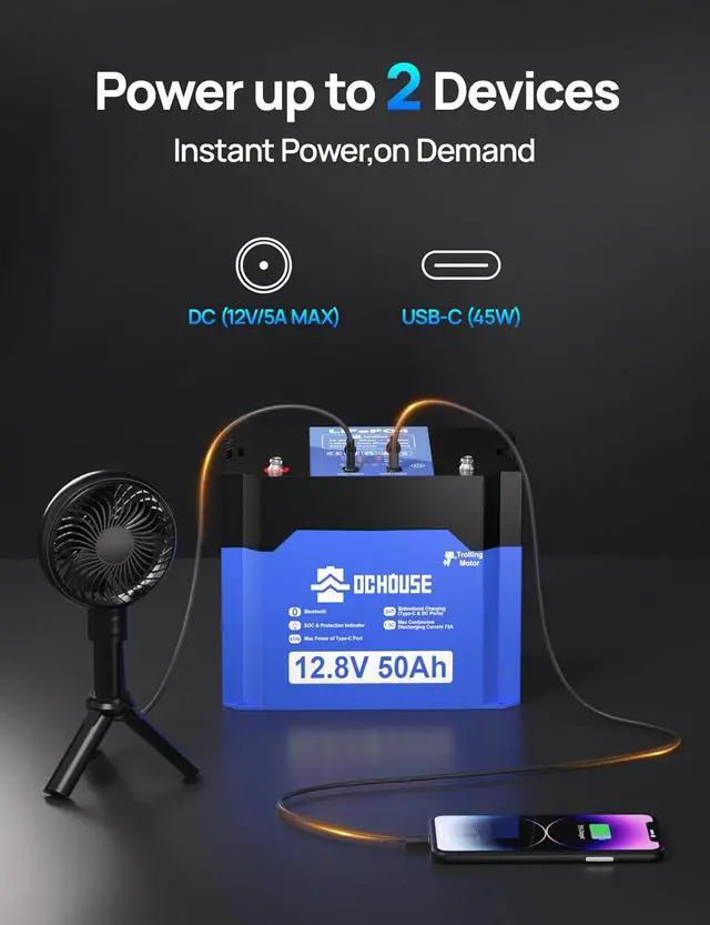 Trolling Motor Exclusive Battery: 12V 50Ah 2.0 trolling LiFePO4 battery equipped with 2 output ports: DC and Type-C, supporting charging for mobile phones, computers, drones, cameras, car refrigerators, and a series of DC equipment charging. 50ah LiFePO4 battery perfect for trolling motors, marine, outdoor camping, RVs, golf carts, etc. Fixed-hole design avoids battery dropsand shocks caused by outdoor bumps.