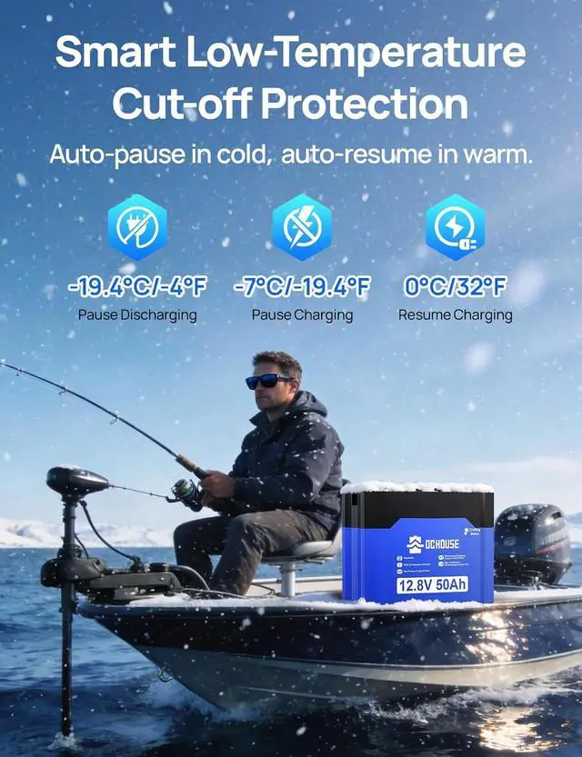 Low Temp Cut-Off: DC HOUSE 12V 50ah 2.0 LiFePO4 battery has upgraded Low Temperature Cut-Off Protection. When the temperature sensor of 50Ah lithium battery detects that the temperature is below 20, the BMS will cut off the charging function, cut off the discharge when it is below -4, and automatically recover after the temperature rises to