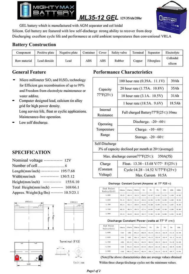 ML35-12GEL is a 12V 35AH GEL rechargeable maintenance free battery. Pack of 2