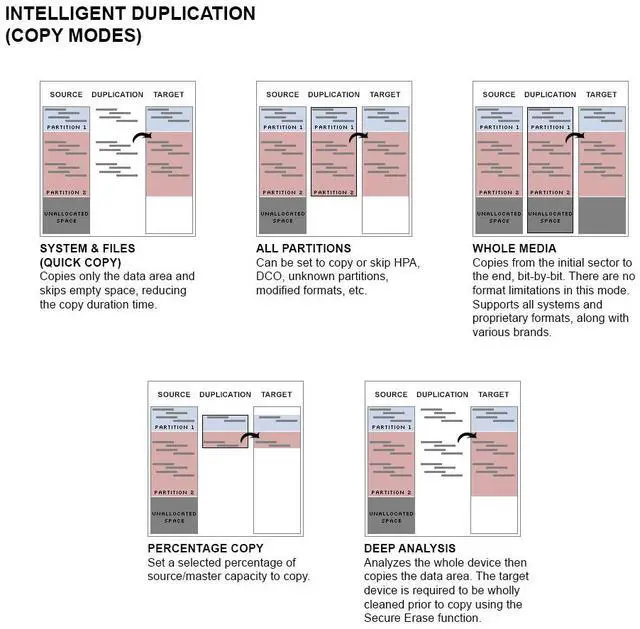 Analyzes the whole device then copies the data area. The target device is required to be wholly cleaned prior to copy using the Secure Erase function.