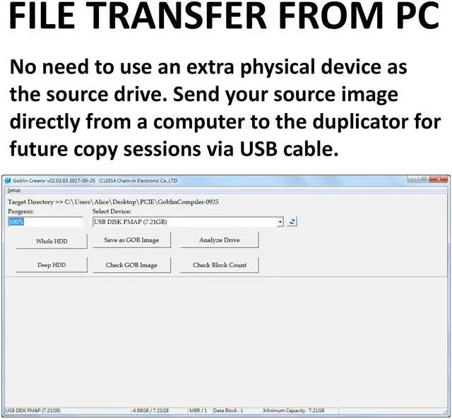 No need to use an extra physical device as the source drive. Send your source image directly from a computer to the duplicator for future copy sessions via USB cable.