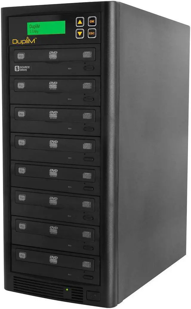 The Duplim 1:7 DVD/CD Copy Tower stand-alone duplicator incorporates the latest 24x DVD recorders for simultaneous DVD copies at up to 24x speed or simultaneous CD copies at up to 48x, without a computer. The 1:7 DVD/CD Copy Tower can also copy to DVD-RAM media and copy up to 8.5GB on Double Layer Media offering the broadest format compatibility available.
