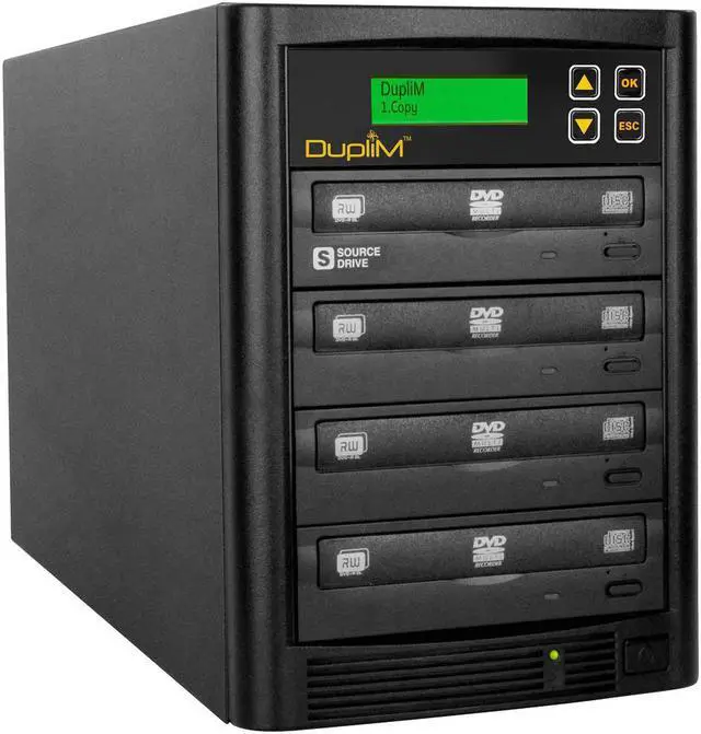The Duplim 1:3 DVD CD Copy Tower stand-alone duplicator incorporates the latest 24x DVD recorders for simultaneous DVD copies at up to 24x speed or simultaneous CD copies at up to 48x, without a computer.