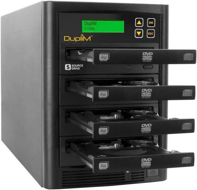 The Duplim 1:3 DVD CD Copy Tower makes a quick copies of a DVD/CD, by just placing the master disc in the source drive, loading in blank media for the number of copies you want and pressing "Copy".