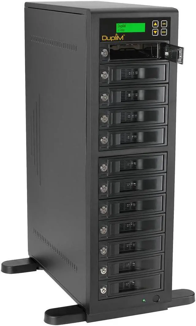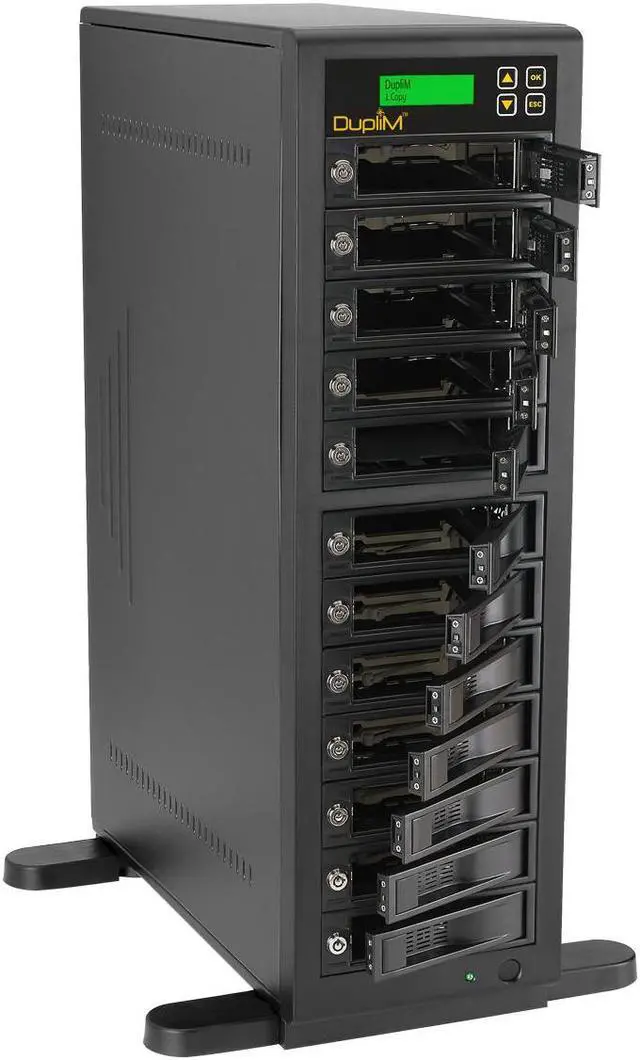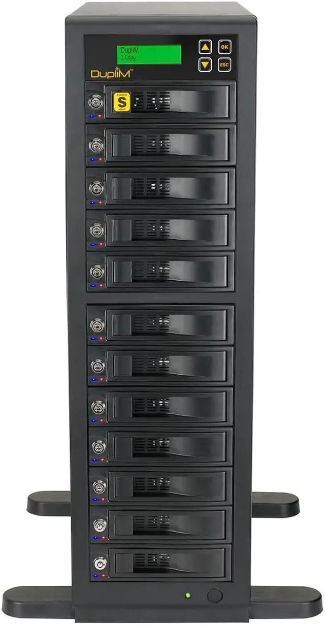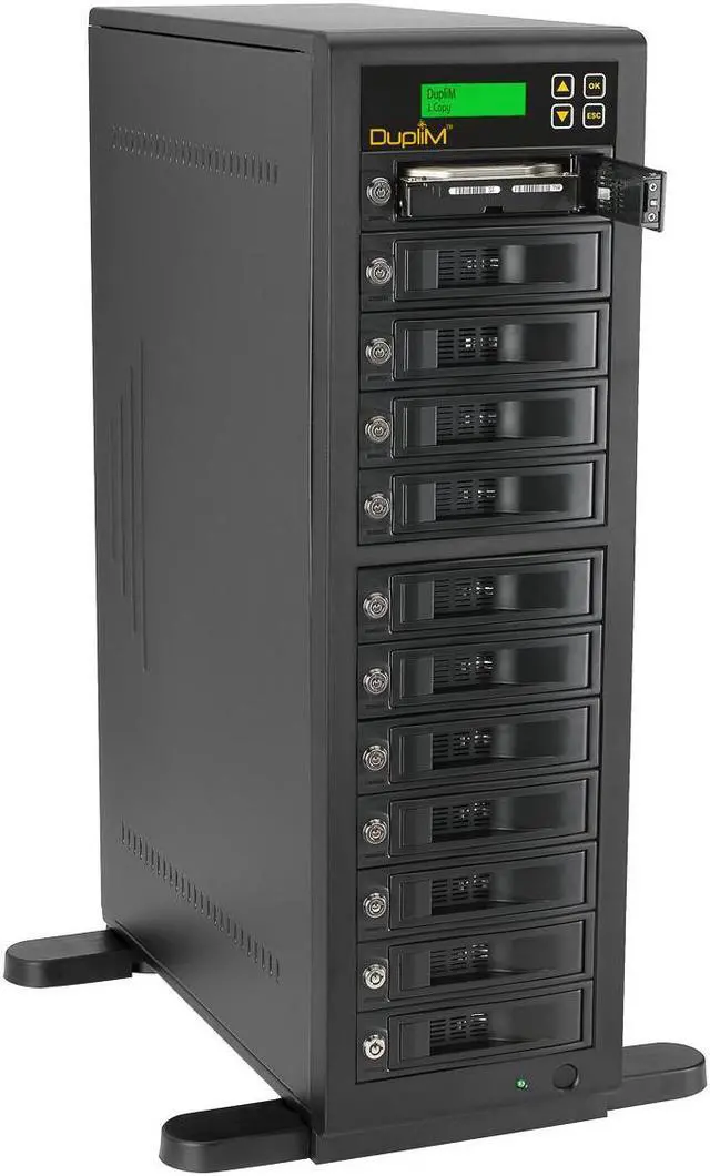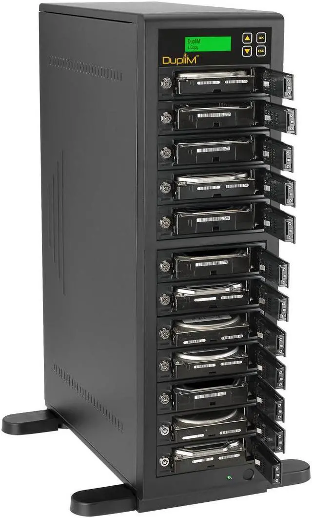 The DupliM 1:11 HDD High-Speed Copy Tower Duplicator is an industrial-strength, standalone hard disk drive duplicator that can create eleven clone hard disk drives simultaneously at speeds up to 300MB/s. It can also securely wipe all the data from up to twelve hard disk drives at a time with Secure Erase or your choice of three comprehensive sanitization algorithms: a one-pass wipe, a three-pass wipe with verify, or a powerful DoD 5220/22-M seven-pass wipe. The unit is compatible with 3.5 internal SATA hard disk drives, and can accept 2.5 SATA drives with optional adapters, not included (P/N 450100).