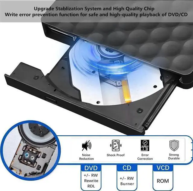 - USB optical drive produces almost no noise while processing discs and thus won't be disturbing.