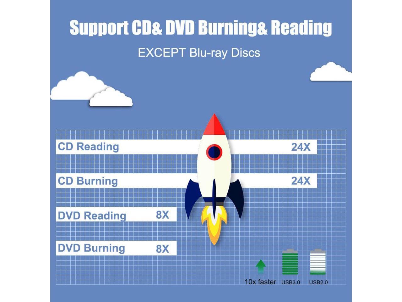 - [USB 3.0 INTERFACE]: The USB 3.0 transfer is 10X speed of USB 2.0, which ups to a maximum of 5Gbps, compatible with USB 2.0 standards; Buffer Under Run Protection Technology (Max 8x DVDR Write Speed, Max 24x CD Write Speed).