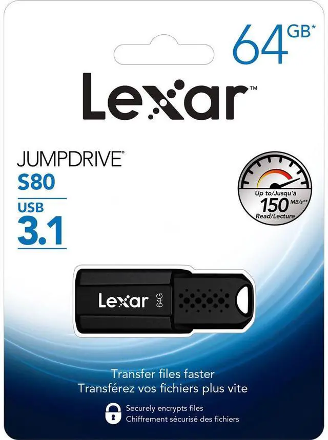 Take your important documents, favorite tunes and movies with you with this Lexar JumpDrive S80 Flash Drive. The generous capacity provides plenty of space for your files, while the USB 3.1 interface enables swift transfer speeds. Slim, retractable design helps protect the connector when it's not in use. Offers speeds of up to 120MB/s read and 60MB/s write for swift access to your saved data. Advanced security software helps protect your information. USB 3.1 connectivity for fast transfers. Backward compatible with USB 3.0 and USB 2.0. Backed by the manufacturer's 2-year limited warranty.