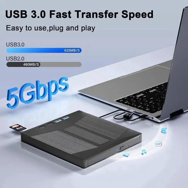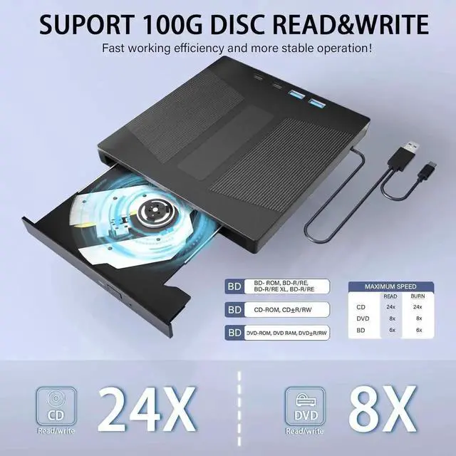 Compared to a standard external Blu-ray drive, this product Support 100G BD disc reading & writing. This blu-ray dvd player features an advanced high-speed 3.0 interface that reaches a maximum speed of 5Gbps, which is 6 times faster than traditional 2.0 (480Mbps). Additionally, the Type-C interface has strong error correction capabilities, impact resistance, and low power consumption, ensuring stable and reliable data transfer. And our drive can read BD discs at speeds of up to 6x, DVDs at up to 8x, and CDs up to 24x.