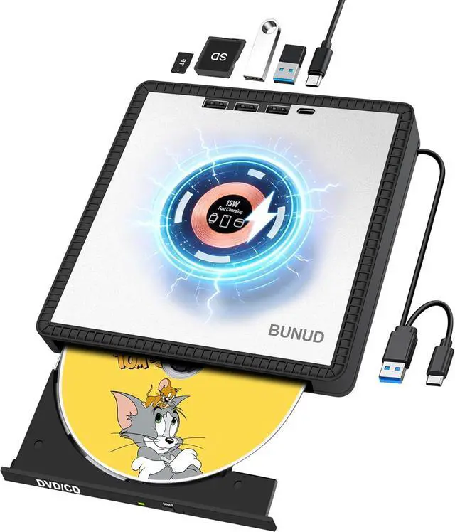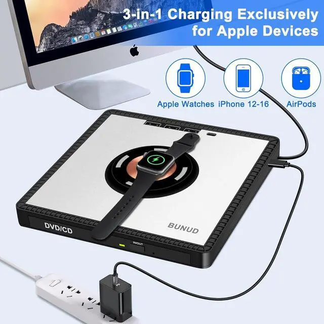 Uniue Design for You: This external DVD drive not only reads/burns CDs/DVDs but also serves as wireless charger, you can use it fast charging for your iPhone12-16/Apple Watches/AirPods. Eliminate cable mess and maximize space. The wireless charging function make you get charging freedom, you can carry it anytime anywhere. And BUNUD cd drive provides considering service and 1 year quality guarantee. If you have any questions about this CD player for laptop, please contact us, we will reply you within 24 hours