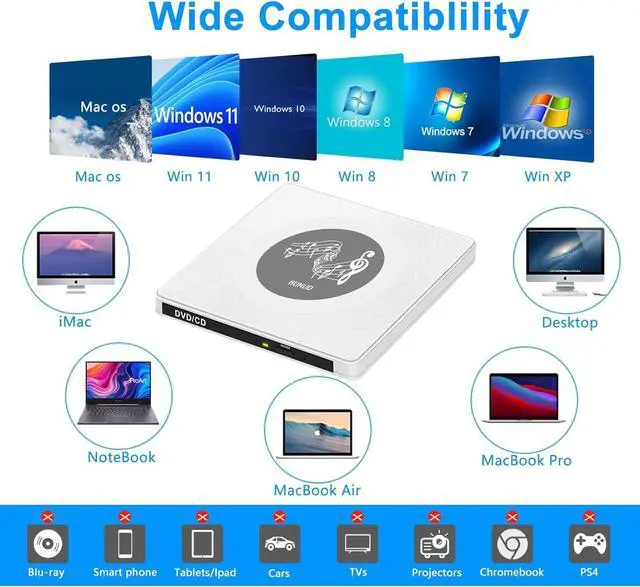 Wide Compatibilityusb DVD drive external is Ideal for various devices, it supports Windows 11/ 10/ 8.1/ 7/ XP, Linux and all versions of Mac OS. You can use the DVD drive on almost all computers such as MacBook Pro/Air, iMac, Mac Mini, Laptop, and Desktop, PC. Please note: This CD drive can not work for iPad/ Tablet/ Projector/ TV/ Chrome OS/ Car/ Smart Phone