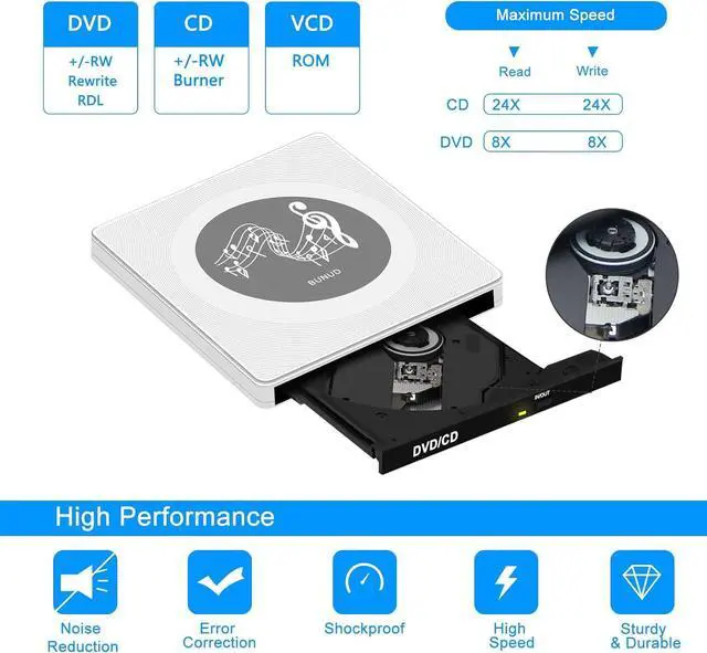 USB 3.0 High-Speed TransmissionExternal CD/DVD drive for laptop with advanced high speed USB 3.0 technology, USB 3.0 is an updated version of USB 2.0 which provides higher data transfer rates up to 5 Gigabits/S, bringing you faster data transmission speed and stable performance fault tolerance