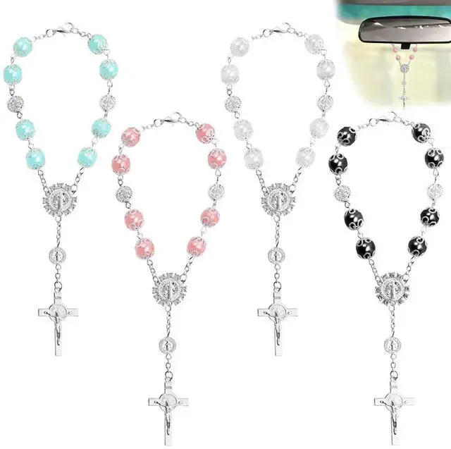 4 Pcs Rosary Beads Catholic, FineGood Cross Car Mirror Hanging Accessories Blessing Auto Rear View Mirror Pendant Car Decor Interior