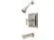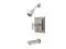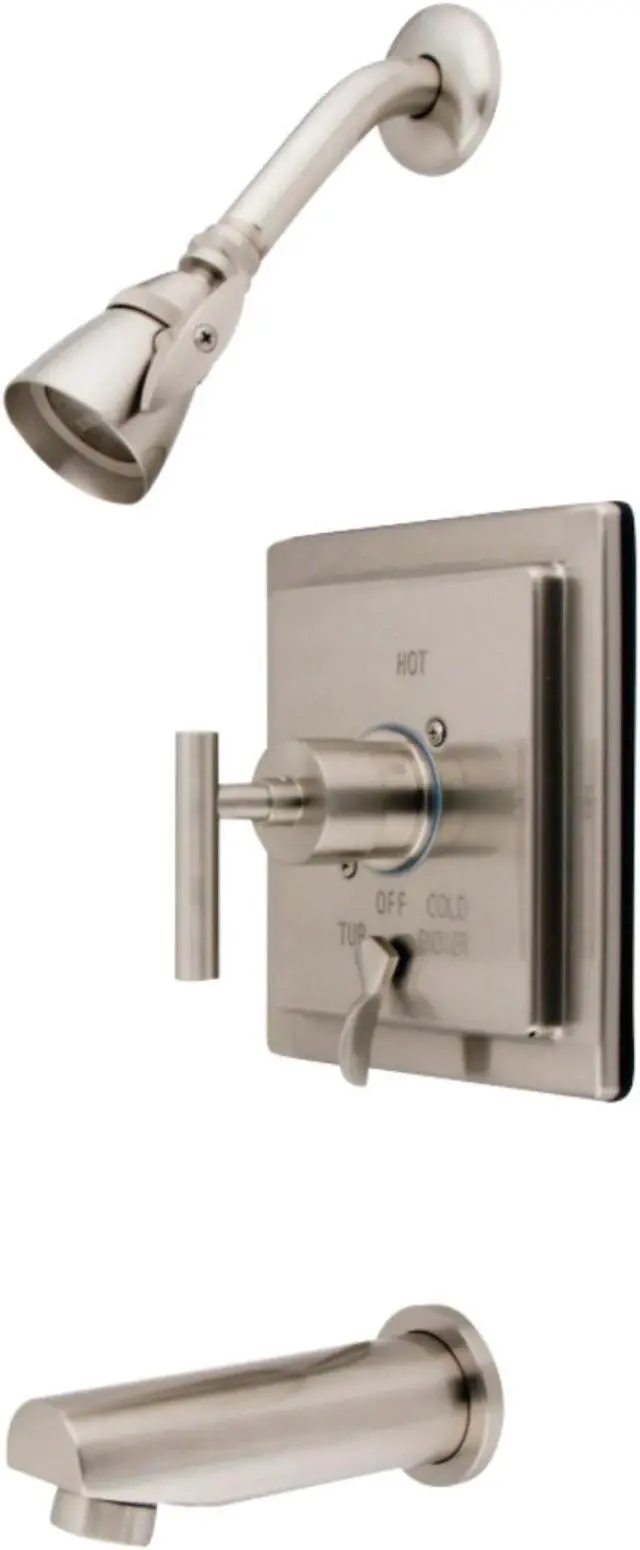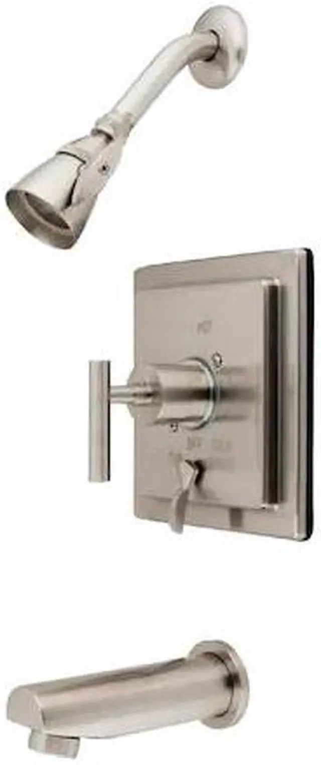Single Handle Tub and Shower Trim with Rough In, Single Function Showerhead, Tub Spout and Metal Lever Handle from the Manhattan Collection Kingston Brass’ primary mission is to become the leading provider of cost effective, high quality products in the plumbing community. Their focus has made them grow by leaps and bounds in just a few years by identifying the key problems in manufacturing today and solving them. Kingston Brass produces high quality products ranging from kitchen, bath, and lavatory faucets to accessories such as diverters, towel bars, robe hooks, supply lines, and miscellaneous parts. With the low price, amazing stock times and quality products, you can rest assured that when you order a Kingston Brass product you will love every part of the experience, and it will last for generations to come. Features: Coordinates well with Contemporary / Modern theme Pressure balanced valve 1/2" IPS connections Handle style: Metal Lever Handshower included: No Number of handles: 1 Specifications: Spout reach: 6" Escutcheon Width: 6.875"