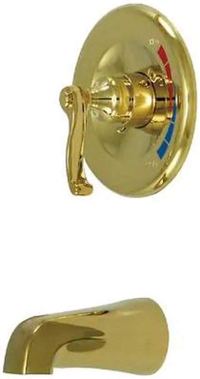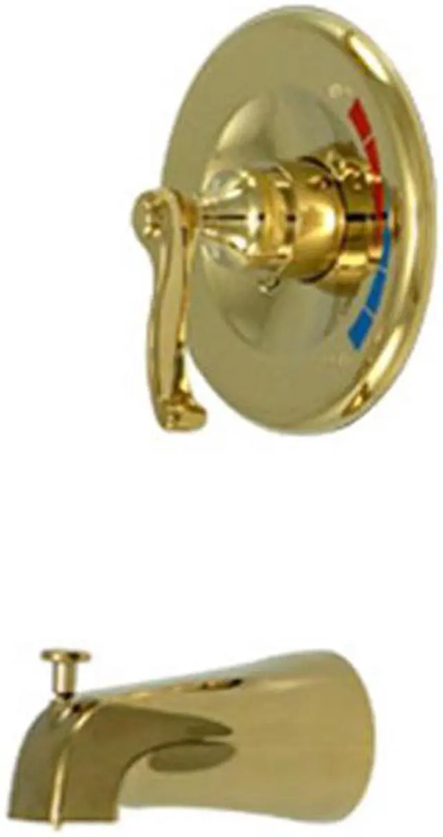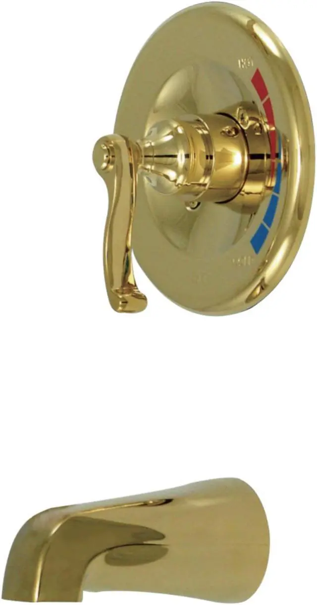Single Handle Tub Only Valve Trim with Rough In Tub Spout and French Lever Handle from the Royale CollectionKingston BrassÁ' primary mission is to become the leading provider of cost effective- high quality products in the plumbing community. Their focus has made them grow by leaps and bounds in just a few years by identifying the key problems in manufacturing today and solving them. Kingston Brass produces high quality products ranging from kitchen- bath- and lavatory faucets to accessories such as diverters- towel bars- robe hooks- supply lines- and miscellaneous parts. With the low price- amazing stock times and quality products- you can rest assured that when you order a Kingston Brass product you will love every part of the experience- and it will last for generations to come.Coordinates well with Contemporary / Modern theme1/4 turn valveWasherless cartridgePressure balanced valve1/2 in. IPS connectionsConstructed from solid brass for durability and reliabilityFinished with a premium color to resist tarnishing and corrosionHandle style: Metal LeverNumber of handles: 1Spout reach: 5 in.Escutcheon Width: 6.75 in. HideHandle Type - FLTOFinish - Polished Brass