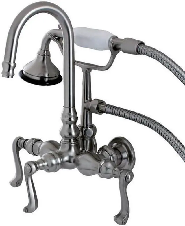 The Restoration Onyx wall mount bathtub filler provides vintage looks combined with outstanding performance and durability. With thee black porcelain lever handles- this clawfoot tub faucet features a high arc -J- spout and a traditional telephone style hand shower. Complete the look of your clawfoot tub with this faucet which installs on 3-3/8- centers on the wall of the tub. This are in4 tarnish and corrosion resistant finishes: Polished Chrome- Polished Brass- Oil Rubbed Bronze or Satin Nickel.