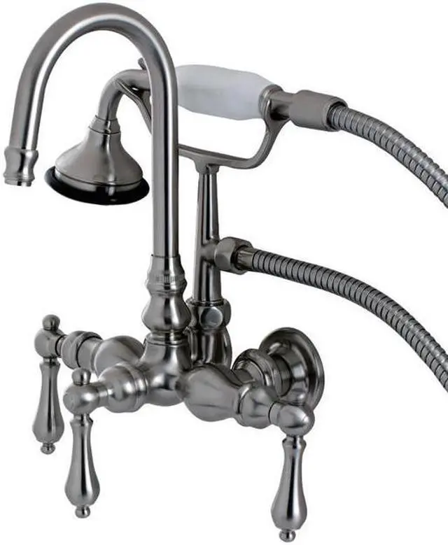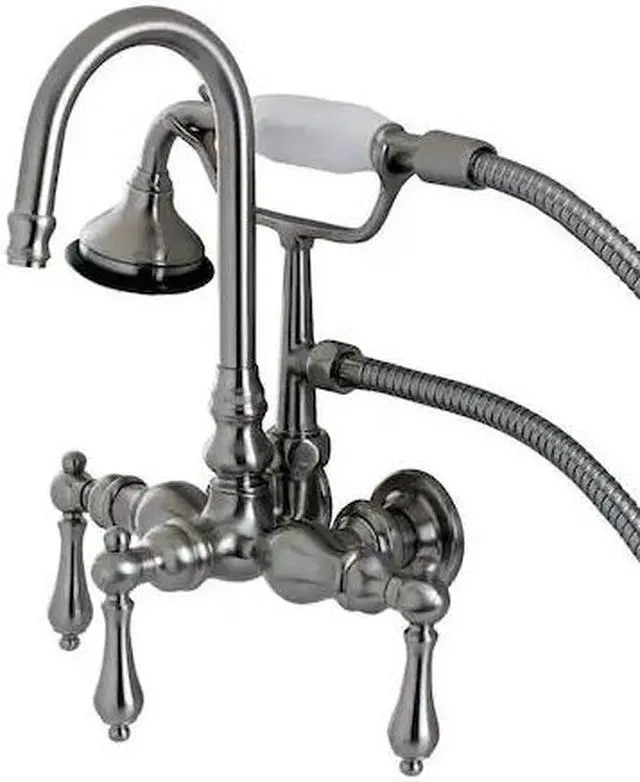 The Bel Air wall mount bathtub filler provides vintage looks combined with outstanding performance and durability. With 3 easy to operate bold lever handles- this clawfoot tub faucet features a high arc -J- spout and a traditional telephone style hand shower. Complete the look of your clawfoot tub with this faucet which installs on 3-3/8- centers on the wall of the tub. This are in4 tarnish and corrosion resistant finishes: Polished Chrome- Polished Brass- Oil Rubbed Bronze or Satin Nickel.
